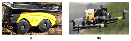 In the next future, a fundamental role will be represented by artificial vision systems able to manage the actions performed by actuator robots on the cultivated products; concerning this topic, the research has already yielded significant results [16]. Below are shown some examples of robots employed to perform different tasks depending on the specific application and crop typology. In Figure 2a, the so-called Vitirover autonomous mower-robot is used to eliminate herbicides being able to mow the grass up to a few centimeters from the foot of vine plants; energy autonomy is guaranteed by photovoltaic cells placed on its roof (for further detail http://www.vitirover.com/) [17]. The robot works on the basis of the global positioning system (GPS) coordinates, provided by the manufacturer, related to cultivated land limits, being able also to avoid any holes or pits; it is controlled by Please verify. or smartphone app and through it, the farmer can manage the robot by positioning it in the ground or vineyard. In addition, the drones are employed in the agricultural sector for monitoring the crops’ growth or pests’ spread; in Figure 2b, the so-named Falcon 8 drone is shown while it is flying over an agricultural land. The drone, provided with eight propellers, is capable of making video footage and, by using some infrared (IR) sensors, to detect the chlorophyll amount inside the vineyards, a fundamental parameter for agronomists and winemakers.