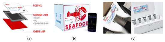 (a) Structure of the TT Sensor PlusTM smart label (b) to monitor the temperature of food products made available through NFC by using the mobile app; (c) TT Sensor PlusTM 2 label applied to a bottle of wine (left) or a pack of drugs [43,44].