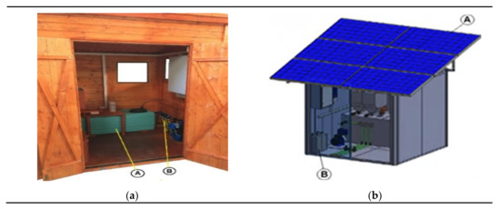 (a) Inside the realized wooden cottage with mechanical and electronic sections of the automated fertigation facility, highlighting the (A) mixing tank and (B) solenoid valves for selecting the land sectors to be irrigated; (b) 3D image of the solar-powered wooden cottage with the fertigation system inside, indicated by arrows the (A) solar panels positioned on the roof and (B) batteries for solar energy storage.