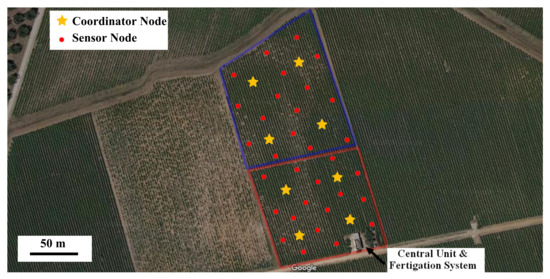 Referring to the agricultural land shown in Figure 6 employed for the cultivation of a vineyard with a total area of just over two hectares, the realized WSN was tested by placing a sensor node every 500 m2 (i.e., 20 nodes distributed for each one-hectare sector, as depicted in Figure 6), all connected, through the coordinator nodes, to a single control unit, that manages the fertigation processes. In this way, two neighboring nodes were spaced up to a maximum value of 25–30 m; such distance was chosen on the basis of some communication tests performed also on similar cultivated fields with plants or crops having a maximum height of 70–80 cm and thin stem, in order to guarantee a low packet loss percentage (<2%). However, the number of sensor nodes has to be chosen according to farmer needs, (e.g., if more crop typologies are placed inside the same sector), taking into account that the NodeMCU board ensures a communication range up to 70–80 m in open-field condition or up to 45–50 m in presence of small plants (as above specified). On the other hand, the realized WSN was tested inside an orchard (in particular cherry trees with 3 m average height), at the beginning keeping the same distance between the nodes (30 m), so obtaining a consequent increase of the packet loss percentage (≈20%) mainly due to the path loss caused by the obstacles; in this scenario, the distance between the nodes has to be reduced up to 20 m, for reducing the packets loss percentage to a reasonable value (<2%).