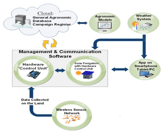 Functional scheme of developed fertigation system with the different hardware and software sections and related data-flow between them; the collected data on the land are processed by the control unit and then shared with the remote general agronomic database in order to be combined with the agronomic and sustainability models as well as weather conditions or forecast.