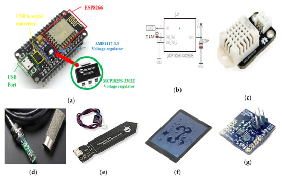 View of ESP8266 NodeMCU module with highlighted the main components included (a) AMS1117-3.3 voltage regulator replaced with the MCP1825S-3302E one; (b) schematic of MCP1825S-3302E voltage regulator used for reducing node power consumption; (c) DHT22 temperature and humidity digital sensor; (d) SEN0193 capacitive moisture sensor (DFRobot); (e) SHT11-based soil temperature and moisture digital probe (Sensirion); (f) 1.5-W amorphous silicon solar panel; (g) LTC3105 energy harvester breakout (by Crispytronics).