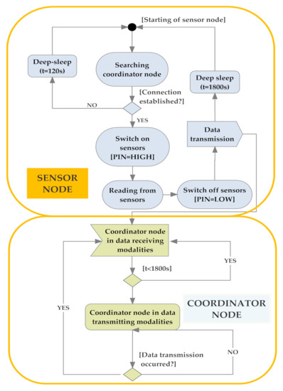 Moreover, because the most energetically expensive phase is the transmission one between sensor nodes, to extend node autonomy, WSN operation was properly optimized according to the flowchart of Figure 9, that describes the operating modalities of both sensor and coordinator nodes. Each sensor node acquires the soil and environmental parameters from sensors and sends them to the relative coordinator node; at the transmission end, the sensor node enters in deep sleep mode for 30 min (time interval settable by user) for reducing its power consumption. If the connection with the coordinator node fails, the sensor node retries this operation every 1 min until the connection is obtained. During the connection phase, sensor nodes belonging to a given sector send acquired data to the corresponding coordinator node; every 30 min this last arranges collected data into a single packet and transmits it to the electronic control unit to be sent, via an Internet connection, to the cloud software platform, and then returns in the receiving mode.