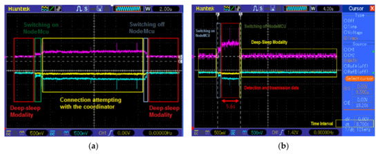 In order to reduce the sensor node power consumption, some structural modifications were performed on the ESP8266 NodeMCU board (manufactured by Espressif Systems, Shanghai, China); particularly, the main one concerns the replacement of the proprietary ESP8266 NodeMCU voltage regulator (model AMS1117-3.3, manufactured by Advanced Monolithic Systems, Livermore, CA, USA) with the MCP1825S-3302E model (manufactured by Microchip Technology, Chandler, AZ, USA, see Figure 8a) featured by a lower quiescent current (typical value IQ = 120 µA) and dropout voltage (typical value ΔV = 210 mV for ILOAD = 500 mA), respect to the same quantities of the initial one (IQ = 5mA and ΔV = 1.1 V for ILOAD = 800 mA). Thereby a significant saving in sensor node power consumption was obtained during the deep sleep mode in which the voltage regulator current consumption is the main contribution.