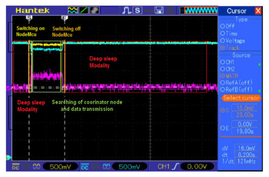 Communication networks have evolved towards the IoT sector; currently, the most widely used technologies are SigFox, LoRa, BLE, Zigbee and Wi-Fi. Depending on the application, one must consider their performance metrics to choose one technology over another. For example, if technology maturity is the metric, Lora can be considered in a low state, Zigbee in a medium state and Wi-Fi in a very high state. Instead, if the availability is the metric, then Lora and Zigbee exhibit a low level while Wi-Fi a high level [64]. Specifically, in WSNs applications in precision agriculture, Wi-Fi technology is an excellent option, even more so if the Wi-Fi connection is established by employing the low-cost ESP8266 module that has an integrated chip with Wi-Fi connection and supports the transmission control protocol (TCP)/IP protocol. The main objective is to provide any ESP8266-based node with access to the Wi-Fi network and act as an acquisition, processing and Wi-Fi communication board. In addition, in order to offset the energy expenditure of Wi-Fi technology, this module has a low-consumption architecture that allows itself to work in 3 different modes: active mode, sleep mode and deep sleep mode, as detailed and implemented in the following sections.