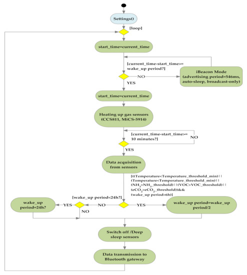 Also, the NH3 represents a good indicator of protein decomposition, thus its concentration can be used to determine meat freshness [65]. Instead, the CO2 monitoring can be used to control the quality of stored cereal and detect their spoilage. In particular, CO2 concentrations between 600 and 1.500 ppm indicate the onset of mold growth due to excessive moisture inside the stored material or moisture infiltration into the structure; instead, concentrations higher than 1500 ppm indicate a serious mold growth affecting the whole material or an infestation of insects inside the stored food [66]. The developed BLE smart tag, offering a multiparameter detection, is featured by great versatility, so allowing its application to different food typologies (e.g., vegetables, fruits, meat, fish, etc.), unlike other devices reported in the literature or present on the market which are tailored for a specific product typology.