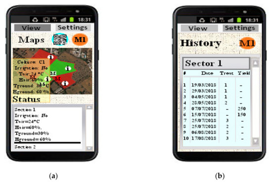 As previously cited, the developed system schedules irrigation and fertigation processes according to the crops need and WSN data, reducing the occurrence of under- or over-watering conditions, thus minimizing any plants stress. In Figure 24a, the temporal trend of soil humidity in the sector 2 is shown; the irrigation was scheduled for 6:00 P.M. (post meridiem), if the soil water content (average value of the data provided by the two sensors) was lower than the set threshold (40%, Figure 24a). However, from 2:00 P.M. to 5:00 P.M. a heavy rainfall occurred, thus the soil humidity exceeded the 40% value, and the scheduled irrigation was canceled, so obtaining water-saving and avoiding tomatoes-plants stress due to overwatering. In fact, in Figure 24a the simulated humidity values, if the irrigation had not been canceled, are reported, calculated taking into account the soil composition (i.e., soil hydraulic conductivity K equals to ), and the amount of precipitated water using the Darcy’s law [74]. For the same day, in Figure 24b, the temporal trends of soil and environmental temperature are shown; such parameters along with the status of the fertigation system are shown to the farmer through the mobile application, as above described (Figure 19a).