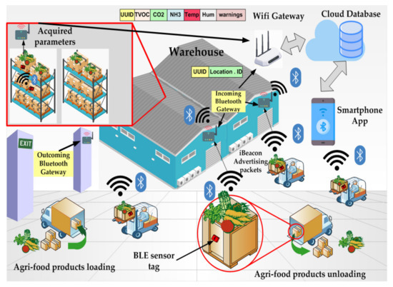 Furthermore, a tracking and tracing system was designed, based on BLE sensor tag applied to the plastic or wooden container, where the fresh or already processed agricultural products are stored. The low-power consumption BLE tag is equipped with several sensors for monitoring the parameters useful to determine the freshness status and the storing conditions of different types of food products (i.e., temperature, humidity, total volatile organic compounds (TVOCs)-level, ammonia (NH3) and carbon dioxide (CO2)-concentrations). The variety of detected parameters makes the realized device extremely versatile for monitoring different food typologies (vegetables, meat, fish, etc.), as demonstrated in the literature analysis in Section 2.3, a unique feature not found in other competitor systems reported in the literature as well as available on the market. Additionally, the developed BLE smart tag is reusable for a long time on the same container or, if the container is damaged, it can be easily removed and applied on another container, as following detailed in Section 3.3. In addition, the iBeacon technology is exploited to support the tracking system in the monitoring of the agri-food stored products on the whole supply chain (SC), so providing a value-added service to the consumers. Alternating iBeacon phase with low duty-cycle acquisition and transmission phases, the developed BLE device acts like a reprogrammable tag capable to monitor the freshness indexes of the stored food typology. A prototype of the BLE smart tag was tested to verify its correct operation and evaluate the energy autonomy, which turned out to be about 5.6 months. A mobile application was developed to remotely monitor the tracking and storing parameters acquired by the BLE tags placed inside the containers with the agri-food products. Both the BLE tag and tracking system were tested in different real operative scenarios, by using oranges and frozen codfish fillets placed inside plastic and polyethylene containers, demonstrating their correct operation.