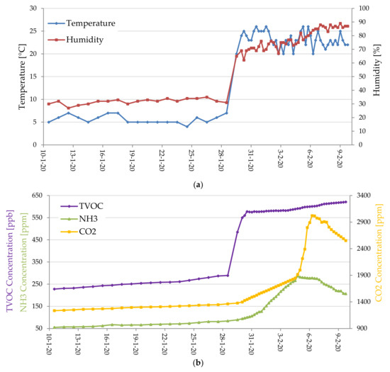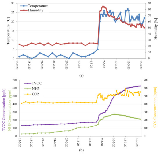 Temporal trends of the parameters detected by the BLE tag applied to the box with inside 500 g of codfish fillets during 30-day-long period. (a) Temperature and humidity; (b) TVOC, NH3 and CO2.