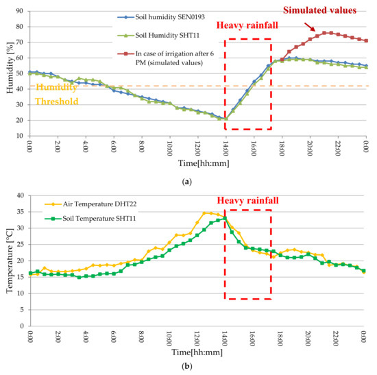 (a) Soil humidity temporal trends acquired on land cultivated with tomatoes (on 22/07/2019, Lecce, Italy); (b) soil and environmental temperature trends acquired by SHT11 and DHT22 sensors on the same day.