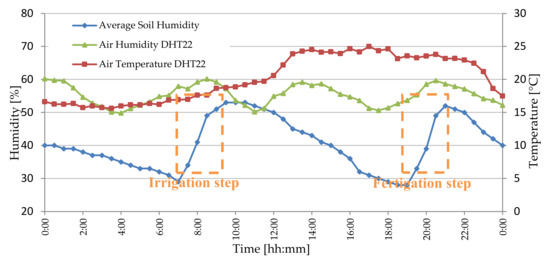 The tests were carried out on 9 September 2019; the soil inside the greenhouse is mainly sandy (i.e., with a low TAW—total available water value) and the lettuce plants are next to harvesting phase; therefore, the agronomic database scheduled, for each day, an irrigation in the morning (at 7:00 A.M., Ante Meridiem) and a fertigation process in the evening (at 7:00 P.M.) for a time duration of 30 min (corresponding to 1600 L), if the average soil humidity was lower than 40%. The fertigation consisted of dissolving 1.7 kg soluble N–P–K fertilizer, with 15–5–20 ratios, into the water amount of a normal irrigation. In Figure 25, the temporal trend of soil humidity (blue line) is shown and the effects of the irrigation/fertigation steps are evident. In addition, the detected air temperature and humidity values (red and green lines, respectively) are used to control the dehumidifier implant, so that the greenhouse environmental parameters can be kept inside the set ranges (i.e., 15–25 °C and 50–60%, respectively for temperature and humidity, Figure 25).