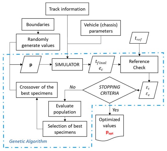 Each specimen in the population represents a set of designs variables of the chassis. The simulator evaluates this configuration of chassis and calculates the final time () and the consumed energy (). These interim results will pass to an error function, where they will be compared with a reference time () and the stored energy in the battery pack.