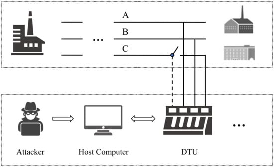 With the rapid development of smart grids, information and communication technologies are widely applied to smart grids, which makes it more complex in structure and inevitably introduces more security issues. The cyberattack on the Ukraine power grid is a typical smart grid attack event that utilized BlackEnergy version 3 to make seven 110 and 2335 kV substations disconnected for three hours []. In 2010, at least 14 industrial sites in Iran were infiltrated by the Stuxnet worm [], Stuxnet falsified the programmable logic controllers’ (PLCs) programming, resulting in the damaging of centrifuges. Due to the limited resources of those terminal devices, the traditional security detection method cannot be deployed, making it difficult to detect if the device has been compromised. As a critical data collection, communication, and control unit in the smart grid, as shown in Figure 1, once the distribution terminal unit (DTU) is attacked and does not detect in time, it will cause undesirable and often severe economic losses and may even cause major casualties.