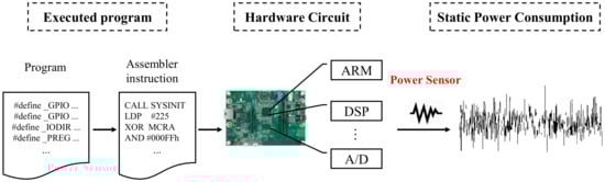 The power and EM side-channel signals are the most commonly used signals for anomaly detection. In theory, compared with EM signals, the accuracy of using power consumption for anomaly detection is higher because the voltage fluctuation in power consumption caused by code execution will radiate out in the form of EM wave through the components of the circuit, such as the processor or random-access memory, which can act as antennas []. And in the process of radiation and reception, the information related to program changes will further be lost. Thus, we select the power consumption signal as the candidate signal.