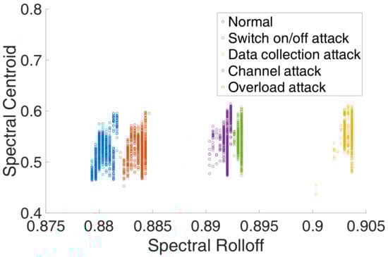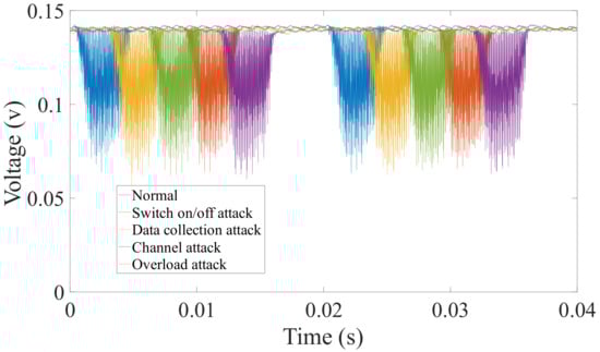 Secondly, from the perspective of experimental evidence, we firstly perform simple experiments on the DTU to verify the feasibility of power side-channel analysis. We launched four attacks and collect the corresponding power signal, and extract 34 features with the PyaudioAnalysis []. Figure 3 shows the original power signal captured by our data acquisition card, and Figure 4 shows the features of different power signals. We can see from the original power signal that although the overall difference between normal and abnormal programs is small, there are still some minor differences. From the features of different power signals, we can see that the features are distinguishable and the gap between different features is obvious. Moreover, we find that the features from the data collection attack have significant differences with other features. We guess that it is because the data collection attack was run on a different operating system version.
