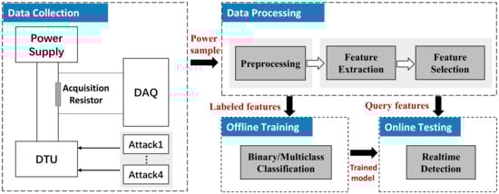 The design of the detection system is mainly composed of two parts, i.e., the hardware design capturing the power consumption of the DTU, and the software design which analyzes the collected power consumption to infer the running status of DTU, as shown in Figure 5. In the following, we will reveal the details of the two parts.