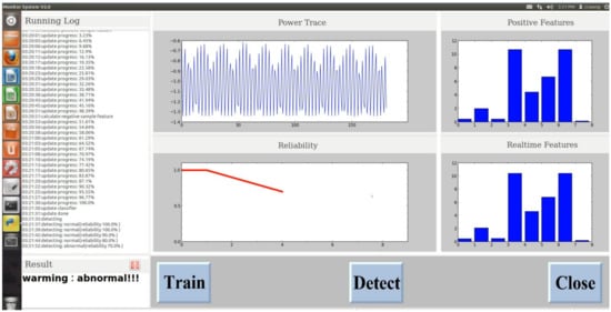 We also developed a monitoring system based on the proposed method to detect any changes to the running program. The system can run on both Windows and Ubuntu systems. The UI snapshot of the system is shown in Figure 7. The UI mainly contains four parts: (1) The running dialog area which displays the detailed operation information including training and testing process and the test results. (2) The results display area which will show the real-time status, for example, when the system detects that the device has been attacked, this area will show the testing result. (3) The display area of power traces, features, and the confidence level of the normal program running in DTU. (4) Button area including three buttons: Train, Detect, and Close.