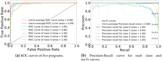 The ROC curves and the Precision-Recall curves of multiclass SVM classification using one-vs-the-rest (OvR) multiclass strategy. Class 0 is the normal program, and class 1 is Attack1, etc. (a) ROC curves of five programs; (b) Precision-Recall curve for each class and iso-f1 curves.