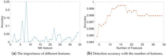 Then, we selected the top N features as the feature set and train the SVM algorithm. The accuracy of testing is depicted in Figure 10b, the accuracy increased with the number of features, and when the number of features is 14, the accuracy is up to the maximum accuracy of 99.94%. However, as the number of features increases, the accuracy begins to decrease. In general, more features mean that more information can be extracted from the sample, but only valid features have a good impact on classification. The top 14 important features consist of the most effective feature set, the other features are redundant features which will have a negative influence on the detection performance. So, the redundant features should be removed before the training model and detection.
