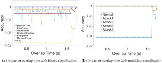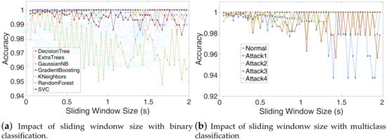 The sliding window size also has an important impact on detection accuracy. To select a proper sliding window size, we use the binary and multiclass classification to evaluate the sliding window size (), which ranges from 0.05 s to 1.97 s, the step is 0.03 s. The overlap time is set to . The evaluation results depicted in Figure 11a,b show that the detection accuracy decreases as window size increase with binary or multiclass SVM, and when the window size is about 0.2s, which approximately equal to 10 times of the execution cycle, the algorithms have better performance. From Figure 11b, we can see that the detection accuracy of the normal program is lower than the other attacks, which means some normal samples have been classified as other samples but the other attacks sample was not easy to misclassify. That is because those attacking programs are modified from the normal program, so the normal program is more similar to every attacking program. We can also see similar results, as shown in Figure 12.