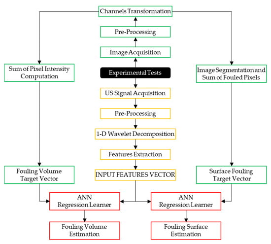 The framework adopted for this paper is illustrated in Figure 2, and it is composed of three main parts: ultrasonic signal processing (yellow boxes), aimed at extracting significant information on the cleaning process; image processing (green boxes) aimed at computing the amount of fouling surface and volume in correspondence to the acquired images; and machine learning-based regression (red boxes) aimed at performing an estimation of surface and volume fouling during the cleaning process.