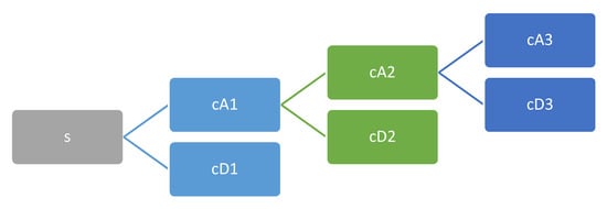 The WPT [40] of a sensor signal generates packets of coefficients computed via scaling and shifting from a selected mother wavelet function. In this way, at the first level of WPT, the original sensor signal S is split into two frequency band packets, which are called approximation cA1 and detail cD1. Likewise, at the second level, each approximation and detail packet are again split into further approximations and details cA2 and cD2, respectively, and the process is repeated until the required level for the application is reached [41], generating a “tree” of decomposition packets, as shown in Figure 4.