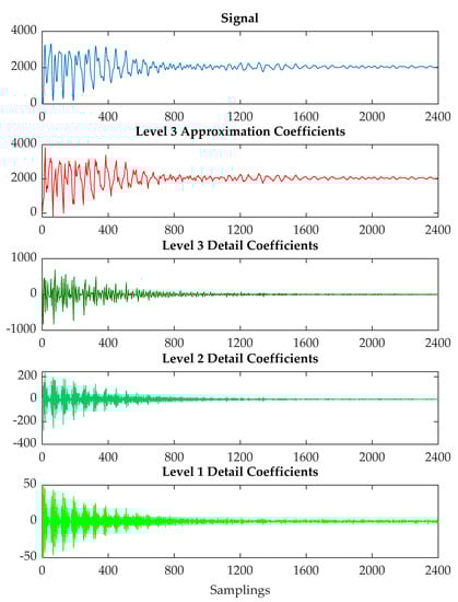 In this paper, the WPT is utilized to process the US signal instances with the aim of extracting significant features on the cleaning state over time. In this respect, a three-level wavelet decomposition was performed on the segmented signal using the order 3 Daubechies mother wavelet [42]. In this way, the coarse scale approximation coefficients and the detail coefficients from the decomposition were extracted from each US signal. Figure 5 displays an example of signal instance and its related details and approximation coefficients.