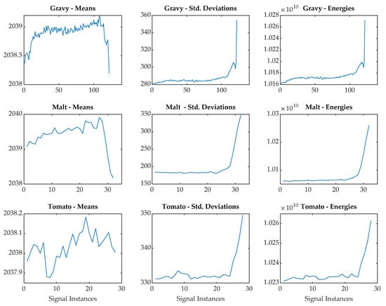 From the decomposition vector, the approximation coefficients were computed for all the signal instances. Subsequently, from the approximation coefficients, a feature extraction procedure was applied to compute a number of statistical features [43], namely mean, standard deviation, minimum, maximum, skewness, kurtosis, and energy. An example of the most significant features is reported for the various fouling materials in Figure 6 with the aim of showing the trends during the cleaning process.