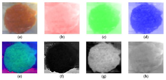 The raw RGB image was subject to a transformation procedure to be mapped into Hue–Saturation–Value (HSV) values [44]. The image channel breakdown is reported in Figure 7 with reference to a Tomato Cold 1 image instance. The HSV domain (Figure 7e) is characterized by three layers, corresponding respectively to the Hue (Figure 7f), i.e., the colour’s position on the colour wheel, the Saturation (Figure 7g), i.e., amount of hue or departure from neutral (zero denotes a neutral shade, whereas 1 indicates maximum saturation), and Value (Figure 7h, i.e., the maximum value among the red, green, and blue components of a specific colour).