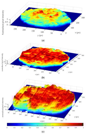 The fouling volume can be graphically visualized as the pixel intensity (z-axis) as a function of the image pixels (x and y axes) shown in the 3D plot reported in Figure 9, where the pixel intensity was normalized between 0 and 1 for an enhanced visualisation.
