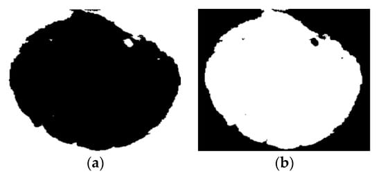 An example of segmented image using the FCM thresholding technique is reported in Figure 10a. To facilitate the computation process, the segmented image was then transformed to its negative, as shown in Figure 10b.
