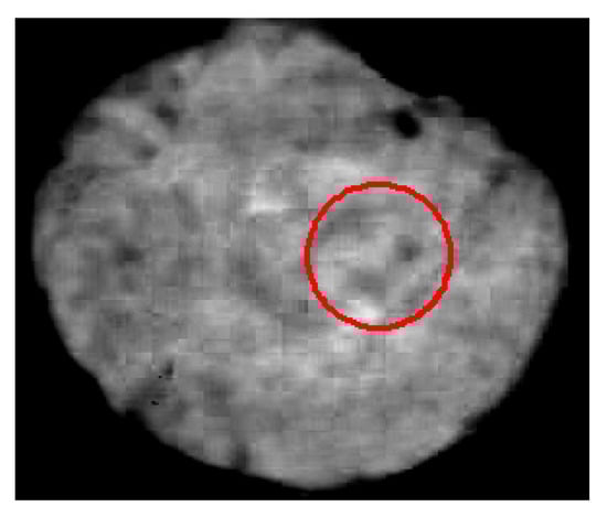 Within the acquired image, a Region of Interest (ROI) was determined in correspondence of the sensor positioning; therefore, the surface fouling and the fouling volume were computed only for the ROI area, i.e., a circle with radius = 45 pixels, as depicted in Figure 11.