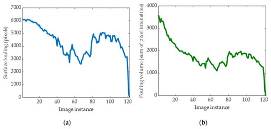 Then, the computation of the fouling volume for the single image instance is computed as the sum of the pixel intensities, , within the image I, as reported in Equation (3).