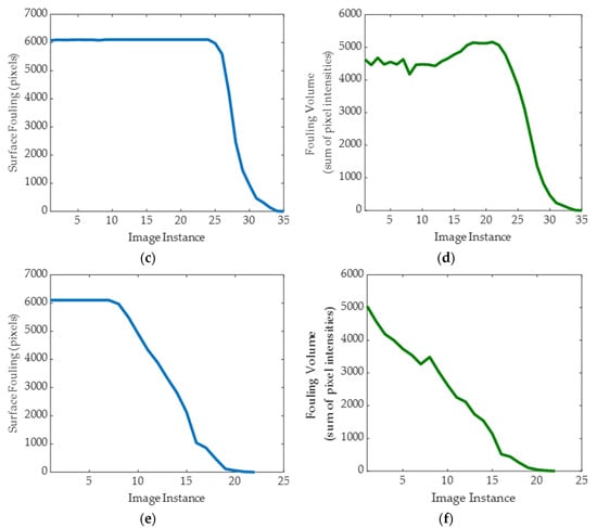 The results in Figure 12 show that for all three fouling materials, the number of fouled pixels and the fouling volume reduces in the ROI during the cleaning processes and achieves a value of zero when all fouling has been removed.
