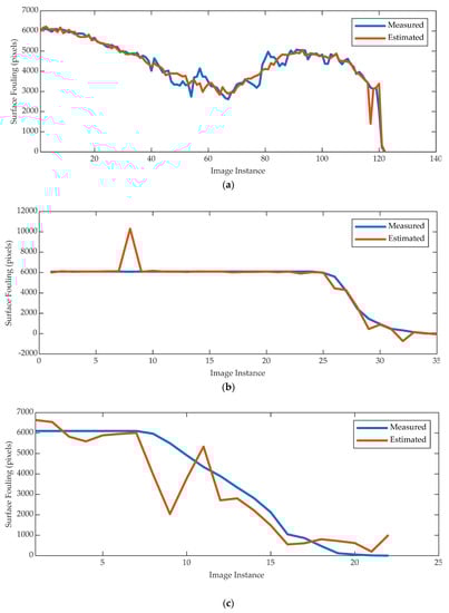 Figure 13 and Figure 14 display the predicted and measured surface fouling and fouling volume for the three different materials. In general, the predicted results are in good agreement and follow the trend of the measured results, highlighting the potential of the technique. There appears to be less error between the predicted and measured results for the fouling volume, whilst the predictions of tomato fouling have the most error, but this could be attributed to the fact that there was less data available to train the models.