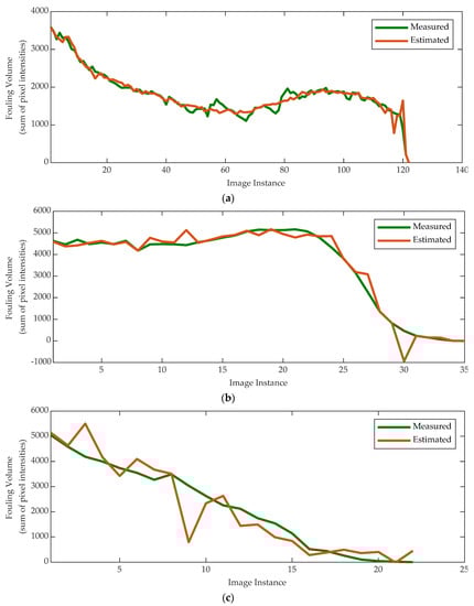 Measured fouling volume vs. NN estimations for gravy_cold_1 (a), malt_cold_2 (b), and tomato_cold_1 (c) tests.