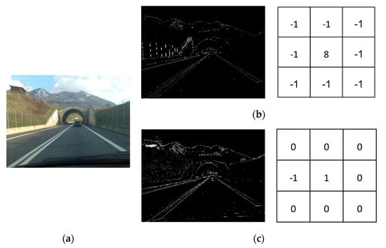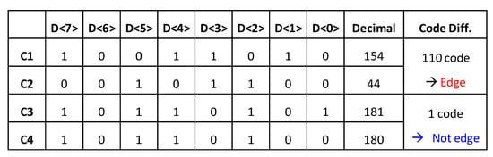 The proposed edge-detection algorithm uses the read-out process of the proposed CIS, in which all column data are sequentially read as 8-bit signals. The read-out operation of a conventional CIS is as follows. First, when the pixels of one row are selected, all the column data of the row are stored in static random-access memory (SRAM) by each column ADC and then read out sequentially from the first column. In this process, the difference in the output code of data between adjacent columns that are stored in SRAM can be obtained to detect edges. Figure 2 shows an example of edge detection during the read-out process. When the threshold value of the code difference between two columns that are judged as an edge is 10, 110 code changes are present from 001,011,002 (C1) to 100,110,102 (C2), resulting in an edge. On the other hand, if one code change exists from 100,110,102 (C3) to 001,011,002 (C4), the region is not an edge because one is less than the threshold of 10. The proposed algorithm can perform functions such as a vertical edge-detection mask because the data-output code difference between columns is detected as an edge. Figure 3 shows a comparison of the edge images and mask for a Laplacian mask and the proposed mask. The edge-detection algorithm recognizes only the edge of the entire image as a valid value and sets all the remaining data to zero. In particular, the road has a diagonal shape, so the shape of the road is accurately recognized even by edge detection between vertical directions. In addition, by detecting only one vertical edge, the result shows that the proposed mask is less sensitive to noise compared with the Laplacian mask. Additionally, the proposed mask can be easily implemented in the conventional CIS structure because of the mask’s simplicity, and the proposed edge-detection CIS can selectively capture either edge-detection 1-bit images or normal 8-bit images.