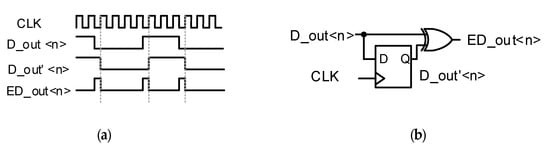 The edge-detector circuit can detect the positive and negative edges of D_out<n> and can detect the change in each bit output from the SRAM. The bit of the edge detector is determined according to the edge threshold. The difference between adjacent pixels that exceed the 15 least significant bits (LSB) out of 256 full-scale codes is less than 10% of the entire image, and this value decreases as the image resolution increases []. Therefore, if the difference is more than 8 LSB in the image, the change could be considered sufficiently sudden, and the region could be processed as an edge in the image. Therefore, the five most significant bits (MSB) of the 8-bit SRAM output go to 5-bit signal edge detectors because the edge threshold is 8 LSB by default. The edge threshold is selectable among 8, 16, and 32. However, in some cases, the value of the most significant 6 bits may be changed by a carry that is caused by a lower bit, for example, from 000,001,112 to 000010002. To avoid this case, we designed an error-correction logic consisting of multiplexers (MUX) by adding an offset to the n + 1 column. For example, when the MSB of 3-bit SRAM (not used for edge detection) is ‘H’, the carry generation signal controls a mux to select the Qb instead of Q, leading to a ‘−1’ code offset of the LSB of 5-bit static random access memory (SRAM) [].