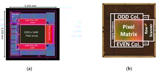 The layout and a photograph of the proposed CIS are shown in Figure 7a,b, respectively. The column-parallel ADC circuits are located on the top and bottom of the pixel array to secure the layout area of the column-parallel ADC circuits. The pitch of a pixel is 1.4 μm, and the pitch of column-parallel ADC is 2.8 μm. The core size, excluding the I/O pad, is 3.75 mm × 3.75 mm, and the APS array size is 2.68 mm × 2.02 mm. The fill factor is approximately 52.55%, and the total power consumption at 60 fps is 9.4 mW.