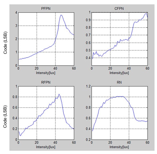 Figure 10 shows the noise performance of the proposed CIS. It should be noted that the ADC of the input range is about 700 mV, and 1 LSB is 2.73 mV. The noises were measured under dark illuminance with 8× of analog gain. When operating as an 8-bit image sensor, pixel fixed pattern noise (PFPN) is within 4 LSB (1.367 mV), and column fixed pattern noise (CFPN), row fixed pattern noise (RFPN), and random noise (RN) were both measured within 1 LSB (342 μV).