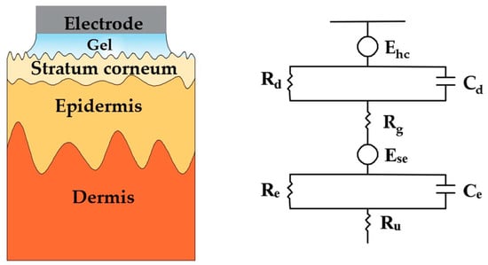 Schematic and electrical equivalent circuit model of electrode–skin interface for wet electrodes.