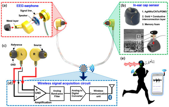 Components and design layout of a personal earphone for recording electrical brain activity. (a) Illustration of structural formation of portable earphones electrode; (b) Images of detailed structures and elements of fabricated earbud that consists of (1) AgNWs/CNTs/PDMS, (2) a conductive interconnection layer covered by a gold layer, and (3) supporting memory foam; (c) Illustration of the placement of each EEG electrodes (source, reference and ground electrodes); (d) Schematic description of signal processing block diagram; (e) The processed EEG data is displayed in real-time on personal devices screen such as a smart phone while in daily life activity [38].