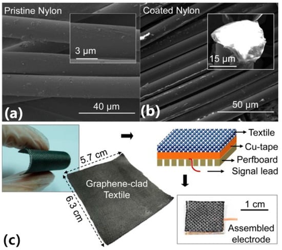 SEM showing (a) pristine nylon fiber; (b) graphene-coated nylon fiber; and (c) photograph of a sample of flexible nylon textile with rGO coating cut into smaller pieces and arranged in an electrode form for ECG testing [60].