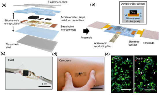 (a) Exploded view diagram of the overall design structure of the system; (b) Illustration of the assembled device; (c) Device held by tweezers in a twisted configuration; (d) Device mounted on skin while compressed by pinching; (e) Fluorescence micrographs of cells cultured on the surface of a device to illustrate its biocompatibility [75].