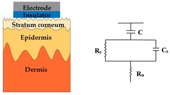 Schematic and electrical equivalent circuit model of electrode–skin interfaces for capacitive electrodes.