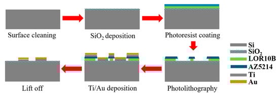The proposed gold-film temperature sensor was fabricated based on E-beam evaporation with the gold target of at least 99.999% purity and the lift-off feature definition process. Prototypes were fabricated based on the substrate of 4-inch single-crystal silicon wafers with natural surface oxidation. The fabrication processing flow of the proposed gold-film temperature sensor is illustrated in Figure 1. The details of the processes are as follows: (1) the surface of the silicon wafer was cleaned by organic solutions and plasma cleaning to remove impurities and organic substances; (2) silicon dioxide was deposited on the surface of the silicon wafer by plasma enhanced chemical vapor deposition (PECVD) as an insulating layer between the metal thin-film and the silicon substrate; (3) the disc was uniformly spin-coated with double-layer photoresist (LOR10B & AZ5214); (4) a ATD1000 laser direct writer was used to define the patterns and transferring the patterns by AZ400 K developer; (5) an E-beam evaporation coater was used to deposit a titanium layer with a thickness of 20 nm and a gold layer with a thickness of 100 nm on the substrate surface, where the titanium layer was an adhesion layer between gold and silicon dioxide; (6) the sample wafer was immersed in acetone and then MIF solution to remove AZ5214 and LOR10B, respectively. In this case, the metal features on photoresist could be lifted off, leaving the required metal features on the substrate. In the end, the samples were be annealed at 300 °C for at least 1 h.