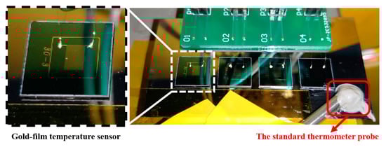The evaluation experiments of the fabricated gold-film temperature sensors were set up in a thermostat. In order to monitor the change of ambient temperature, a commercial standard thermometer (Model 1504 from FLUKE) was used. The gold-film temperature sensors and the standard thermometer for metrology were placed into the thermostat. The temperature readout circuit was placed outside the thermostat and was covered by a metal case for electromagnetic shielding. The temperature sensor chips and the standard thermometer probe (Model 5643-D from FLUKE) inside the thermostat chamber were shown in Figure 3. In order to ensure good heat conduction, all the temperature sensor chips and the thermometer probe were glued on the same silicon substrate. Depending on resistance and sensitivity, different chips were used for the following experiments, and the list was shown in Table 2. In order to suppress the electromagnetic interferences, a multiplayer shielding case was used in all experiments below.