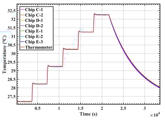 Consistency represents the quality of the fabricated temperature sensors and evaluates how closely they agree with each other. In the consistency study experiment, three temperature sensors with a higher sensitivity, Chip E-1, Chip E-2 and Chip E-3 from the same batch were studied. The thermostat was set to 30 °C, and the sampling rate of the temperature readout circuit outputs was 1 Hz. The consistency test results are illustrated in Figure 7, showing that the difference between the temperature sensor chips was within 0.02 °C. The correlation coefficient of the temperature outputs between the fabricated temperature sensors and the standard thermometer was 0.95, which indicates the fabrication tolerance was reasonably good.