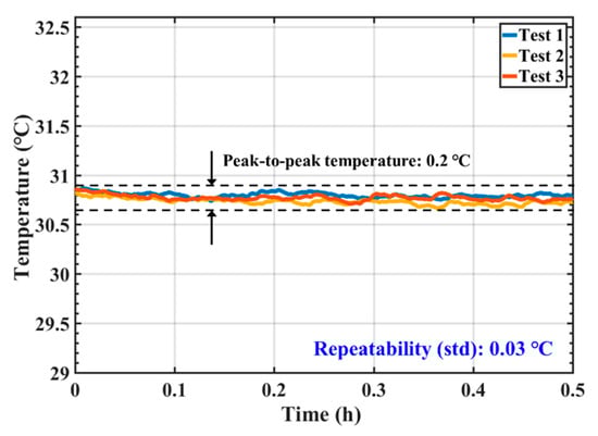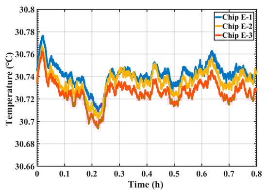 With the same experiment setup as the consistency experiment, the repeatability of the Chip E sensors was also investigated. Three tests were conducted: Test 1 and Test 2 were performed in the morning and afternoon of the same day. Test 3 was conducted 7 days after Test 1 and Test 2. The resulted of the repeatability experiment of Chip E-1 were shown in Figure 8. The average temperature of Test 1 was 30.798 °C with a standard deviation of 0.002 °C; the average temperature of Test 2 was 30.733 °C with a standard deviation of 0.003 °C; the average temperature of Test 3 was 30.772 °C with a standard deviation of 0.003 °C. The peak-to-peak temperature difference of the three measurements was 0.2 °C. The repeatability of Chip E-1 equals to the standard deviation of 0.03 °C. Other two Chip E sensors had the same performance. The good repeatability performance suggests the proposed temperature sensors were generally reliable.