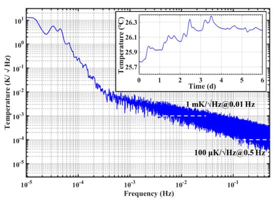 The experimental results are shown in Figure 10. It can be seen that the entire temperature change was about 0.6 °C during 6 days. The noise floor of the proposed gold-film temperature sensor Chip E-1 was 1 mK/√Hz@0.01 Hz and 100 μK/√Hz@0.5 Hz within a temperature measurement range of 15 °C to 40 °C.